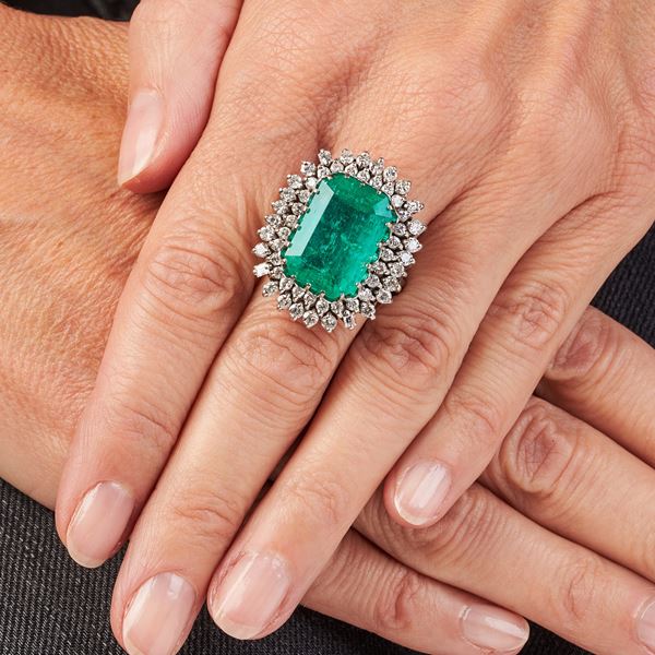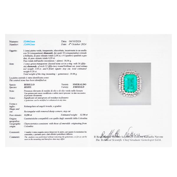 Misura 17Diamanti taglio brillante per ct 2.22, colore H-I, SI e smeraldo taglio smeraldo di ct 12.50, corredato di certificazione RAG num j24062mn del 04.10.2024, gr 18