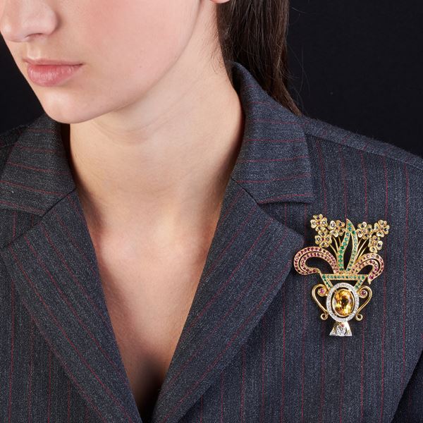Grande spilla a vaso in oro giallo, quarzo giallo, diamanti, smeraldi e zaffiri