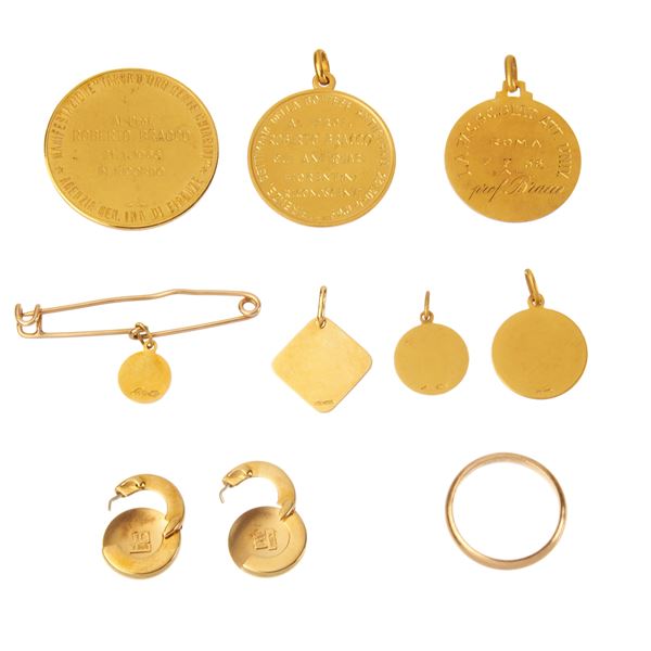 Lotto di medaglie, pendenti e copribottoni in oro 18 kt
