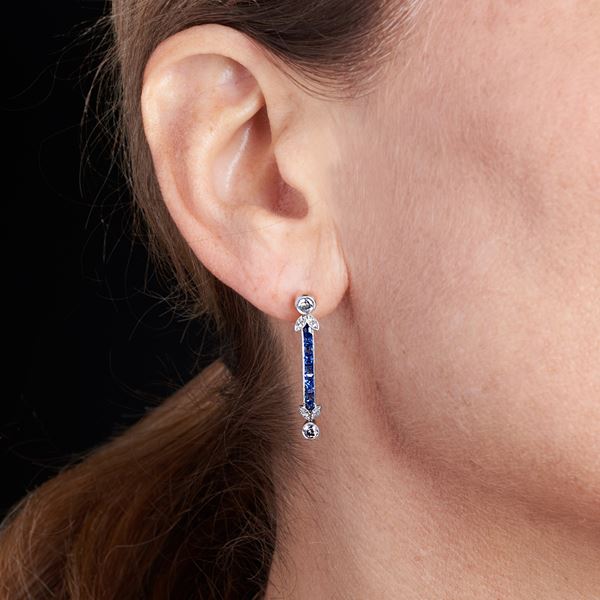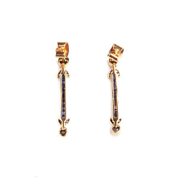 Paio di orecchini a barretta in oro giallo, zaffiri e diamanti