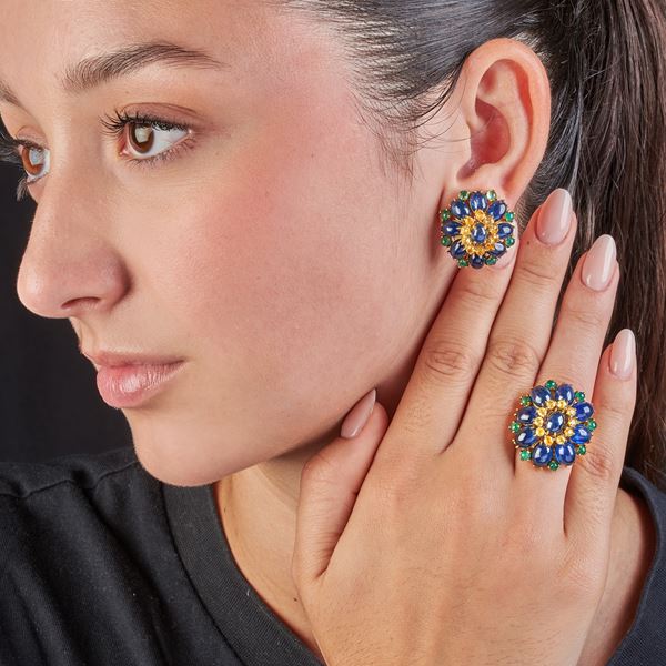 Orecchini cm 2 x 2.5h, anello 14Zaffiri taglio cabochon ovale per ct 46, smeraldi taglio cabochon rotondo per ct 3.60, zaffiri giallo per ct 3.0 circa, firmati Irea, gr 33.2 complessivi