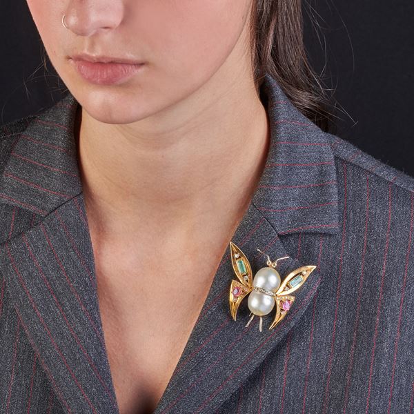 Spilla Farfalla in oro giallo 18 kt, perla scaramazza, diamanti, rubino, tormalina ross e smeraldi