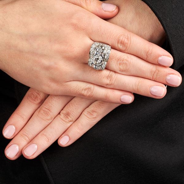 Misura 16Diamante centrale di taglio brillante, con apice aperto, di ct 2.10 circa, colore G, P1, diamanti laterali taglio carrè, brillante e huit huit per ct 2.60, colore G-H, SI, gr 17