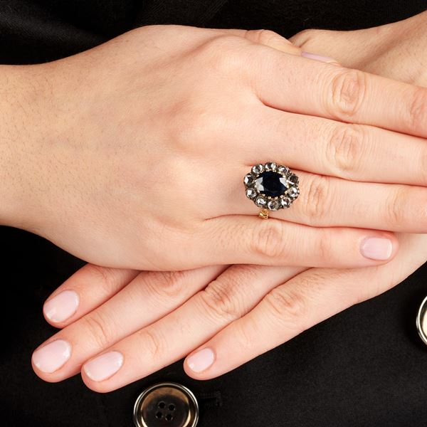 Misura 11Zaffiro taglio ovale di ct 3.50, rose di diamanti ct 0.50 circa, gr 6.2