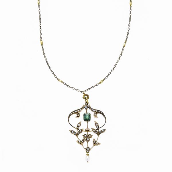 Collana in oro a 9 kt e microperle e pietra verde ed un'altra collana con zaffiri