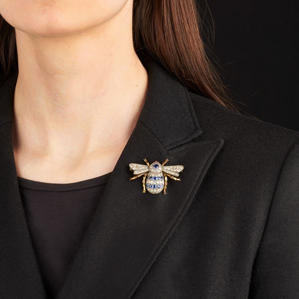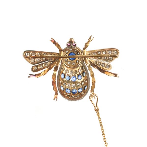 Grande spilla Ape in oro giallo 18 kt, argento, diamanti e zaffiri