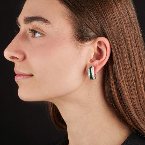 Paio di orecchini a cerchio in oro bianco 18 kt, diamanti e smeraldi