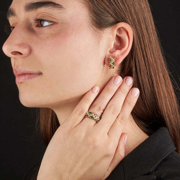 Paio di orecchini e anello in oro giallo 18 kt, diamanti, smeraldi e rubini