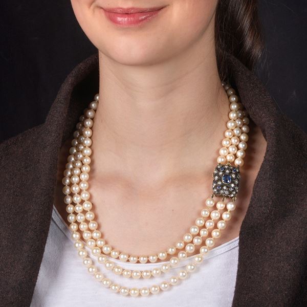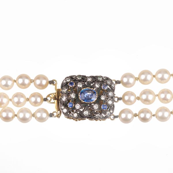Collana a tre fili di perle coltivate, oro giallo 18 kt, argento, diamanti e zaffiro