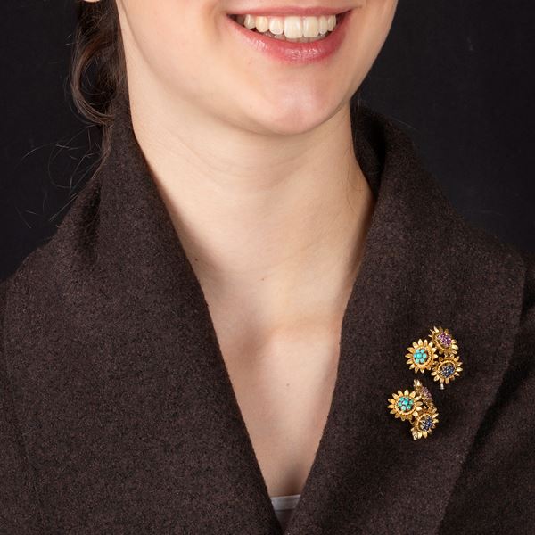 Due clips di ispirazione floreale in oro giallo 18 kt, turchesi, rubini e zaffiri