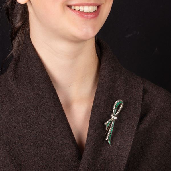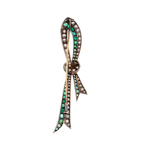 Grande spilla Fiocco in oro basso, oro giallo 18 kt, diamanti e smeraldi