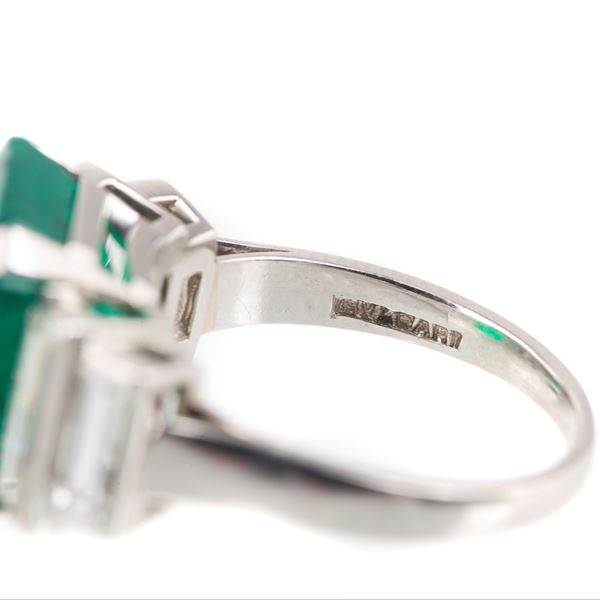 Misura 11Smeraldo taglio ottagonale di ct 7.15, quattro diamanti taglio baguette per ct 1.30, firmato BULGARI, la firma non è di facile lettura, corredato di certificato R.A.G. , gr 7.1