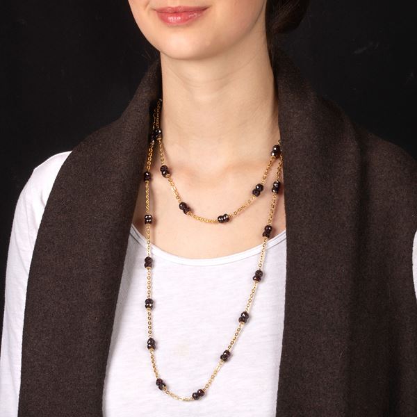 Lunga collana e braccialetto in oro giallo 18 kt e granato