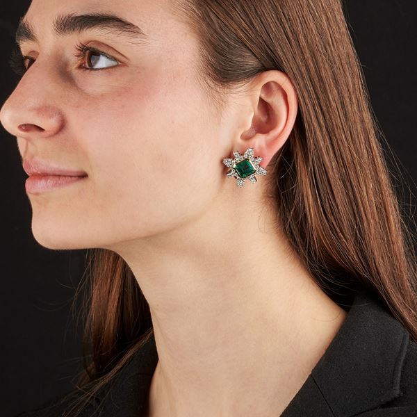Paio di grandi orecchini in oro bianco 18 kt, oro giallo, diamanti e smeraldi