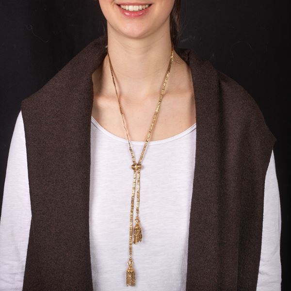 Paio di orecchini pendenti in oro 9kt e microperle e Lunga collana saliscendi in oro 9kt