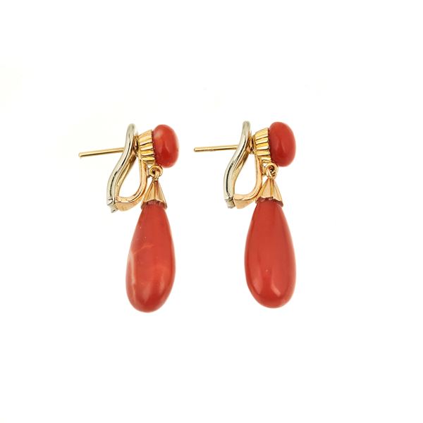 Paio di orecchini pendenti in oro giallo 18kt e corallo rosso