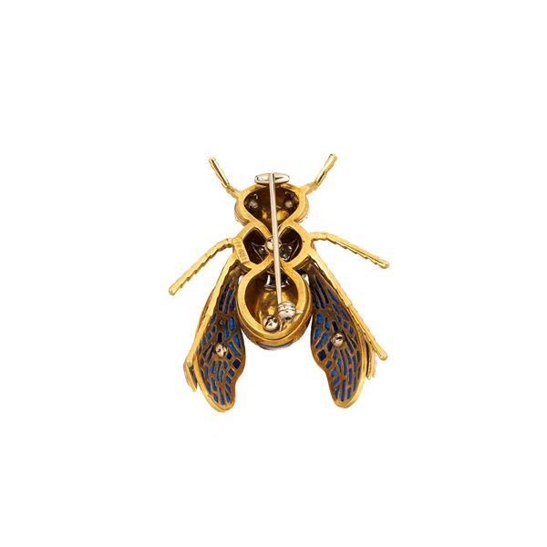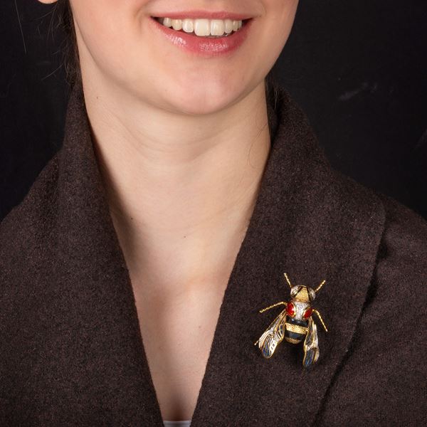 Spilla Ape in oro giallo 18 kt, diamanti e smalti policromi
