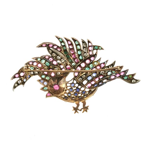 Spilla Pappagallo in oro a basso titolo, zaffiri, smeraldi e rubini naturali