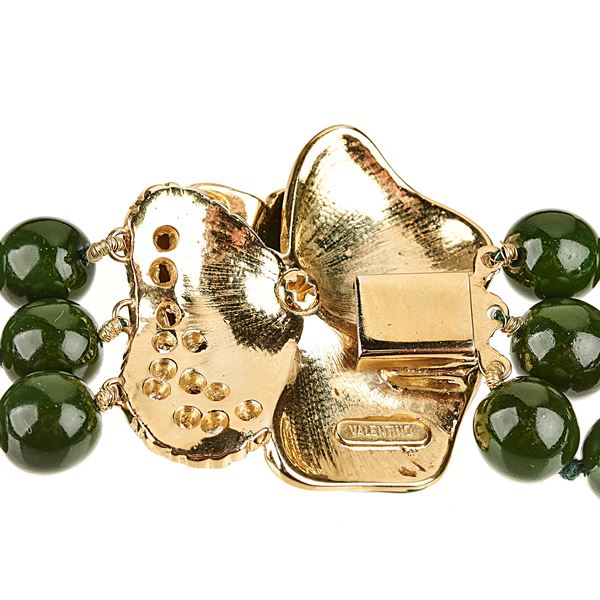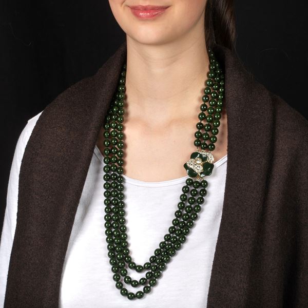Lunga collana a tre fili in perle verdi, chiusura floreale in metallo e strass