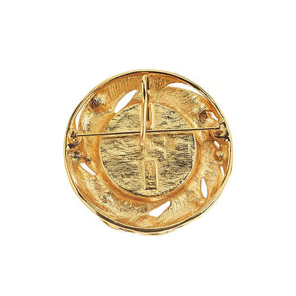 Grande spilla in metallo dorato, resina e strass di vari colori