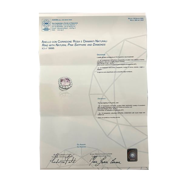 Misura 11Zaffiro rosa violaceo naturale taglio cuscino di ct 27-29 e diamanti taglio brillante per ct 4.80 circa, colore H, VS, l'anello è corredato di certificato IGI COM, num. 59365, del 28.05.2025, gr 19.6