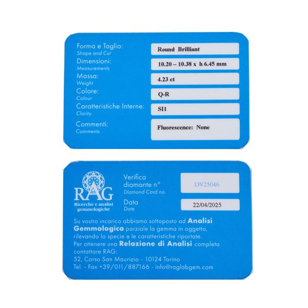 Diamante taglio brillante di ct 4.23, colore Q-R, purezza SI1, corredato di certificazione R.A.G., numero DV25046 del 22.04.2025, gr 3.6