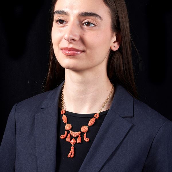 Catena a maglie in oro giallo 18 kt e charms in corallo rosa inciso