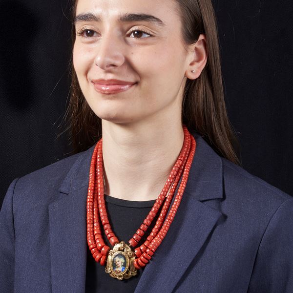 Collana a tre fili in corallo rosso degradè, oro giallo 18 kt e miniatura raffigurante Dama