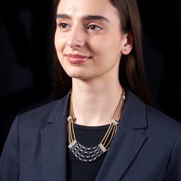 Collier in oro giallo 18 kt, oro bianco, diamanti e zaffiri