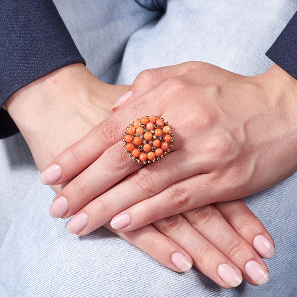 Grande anello a scudo in oro rosa 12 kt, pietre e corallo rosa