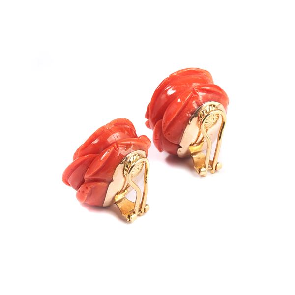 Paio di grandi orecchini a clips in oro giallo 18kt e corallo rosso inciso come una rosa
