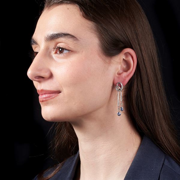 Paio di orecchini pendenti in oro bianco 18 kt, diamanti e zaffiri