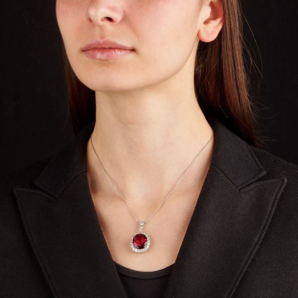 Pendente cm 2 x 3 hRubellite rosa taglio ovale di ct 10 circa, diamanti taglio brillante per ct 1.70, colore G-H, VS, gr 7.5