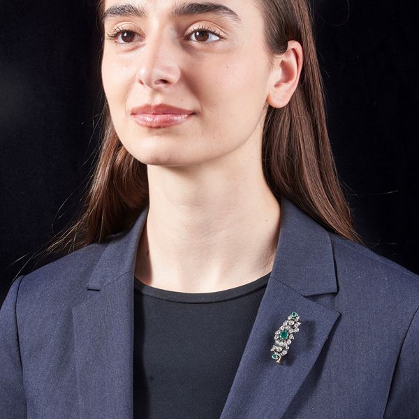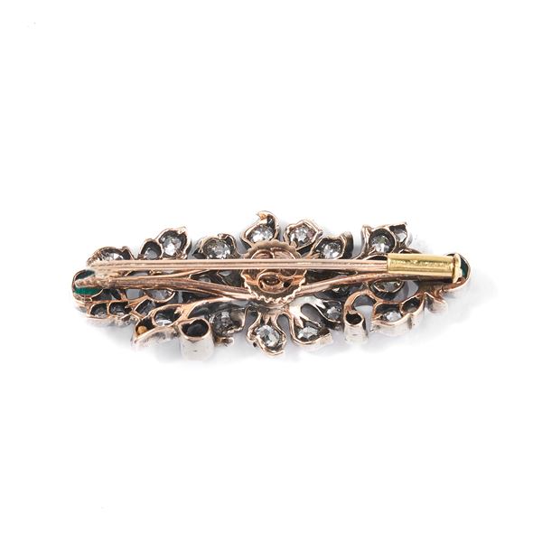 Spilla di ispirazione floreale in oro a basso titolo, argento, diamanti e smeraldi