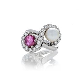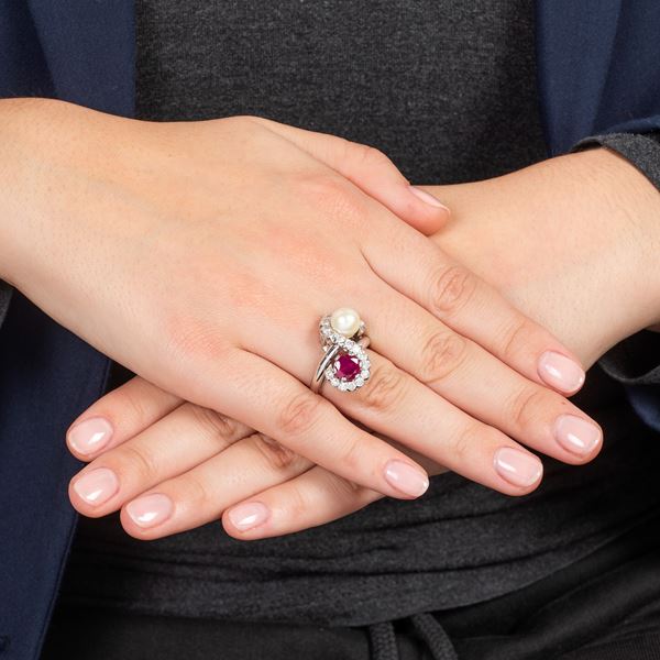 Anello contrariè in oro bianco 18 kt, diamanti, perla e rubino