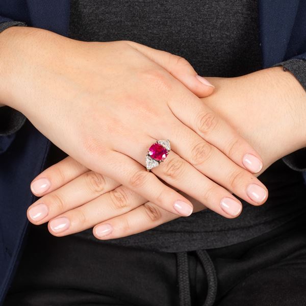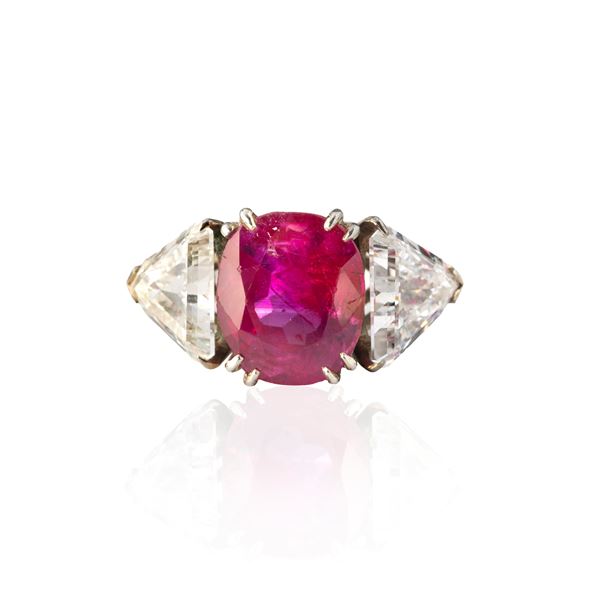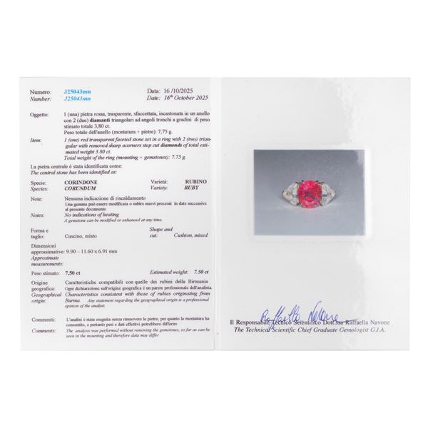 Misura 14Rubino Birmano naturale taglio cuscino misto di ct 7.50 circa, due diamanti taglio triangolare di ct 1.80 circa l'uno, colore I-VS, corredato di certificazione R.A.G num. J25043mn del 16.10.2025, gr 7.75
