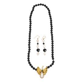 Collana in onice, oro giallo 18 kt, zaffiro e perla mabè e orecchini in oro18 kt, perle e onice