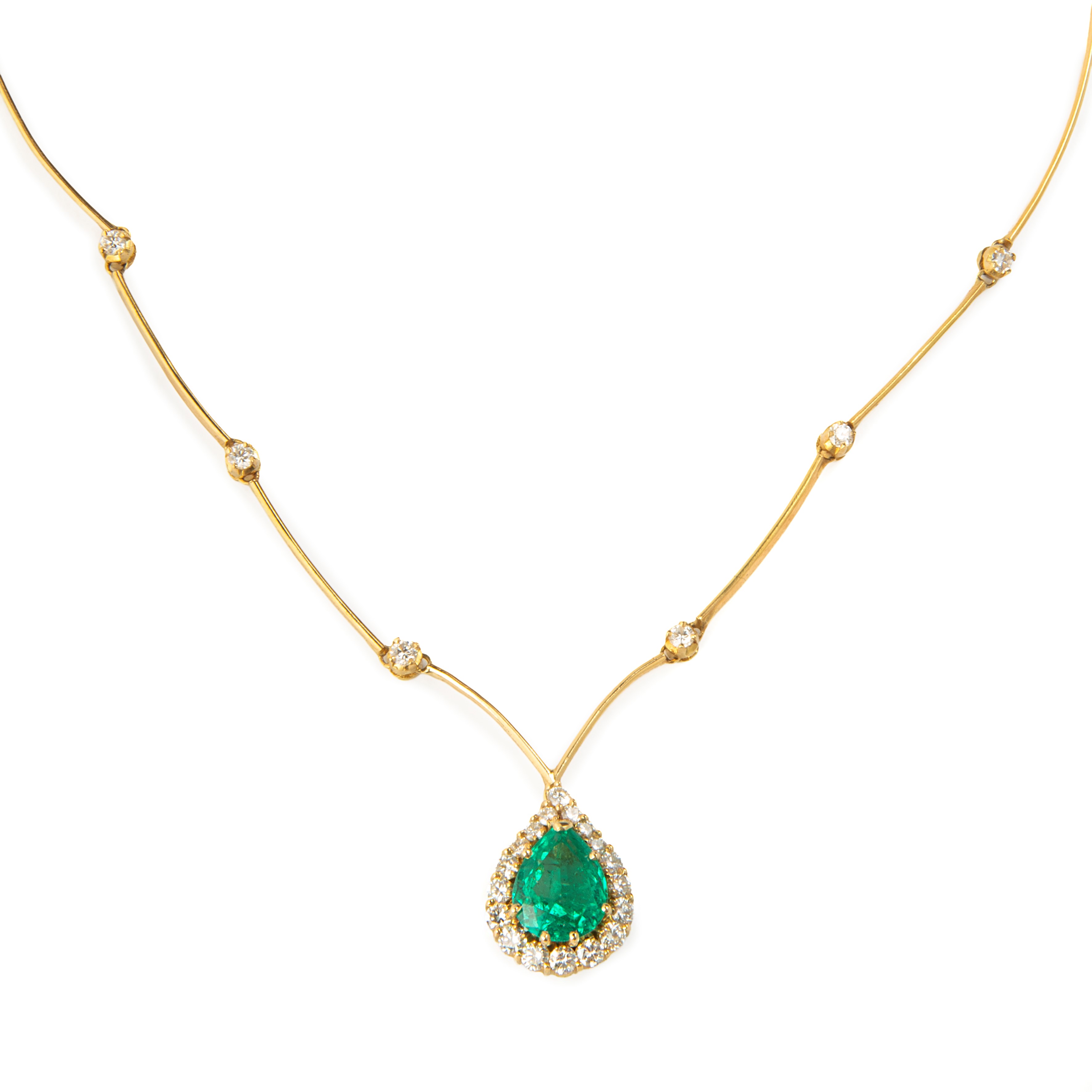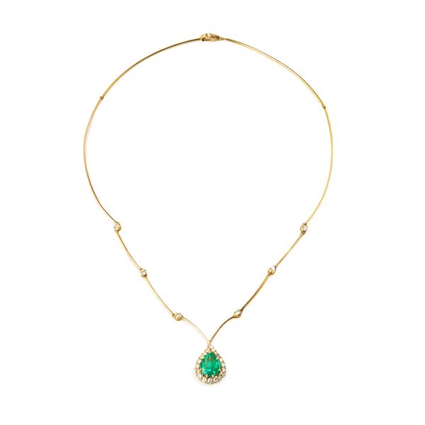 Aperta lunghezza cm 47Smeraldo taglio goccia di ct 3.30, diamanti taglio brillante per ct 1.50 circa, colore H_I, VS, gr 15.9