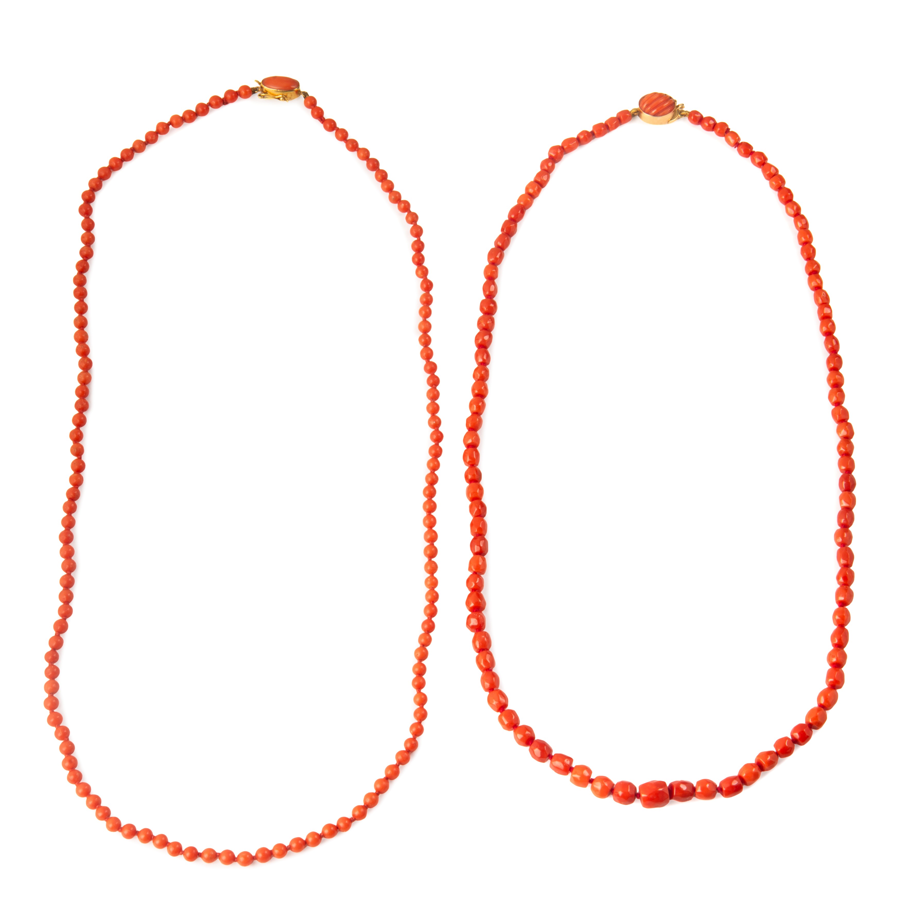 Aperte lunghezza cm 54 e 64Perle in corallo rosso, una collana da mm 4 a 8 e l'altra mm 4, gr 50.9