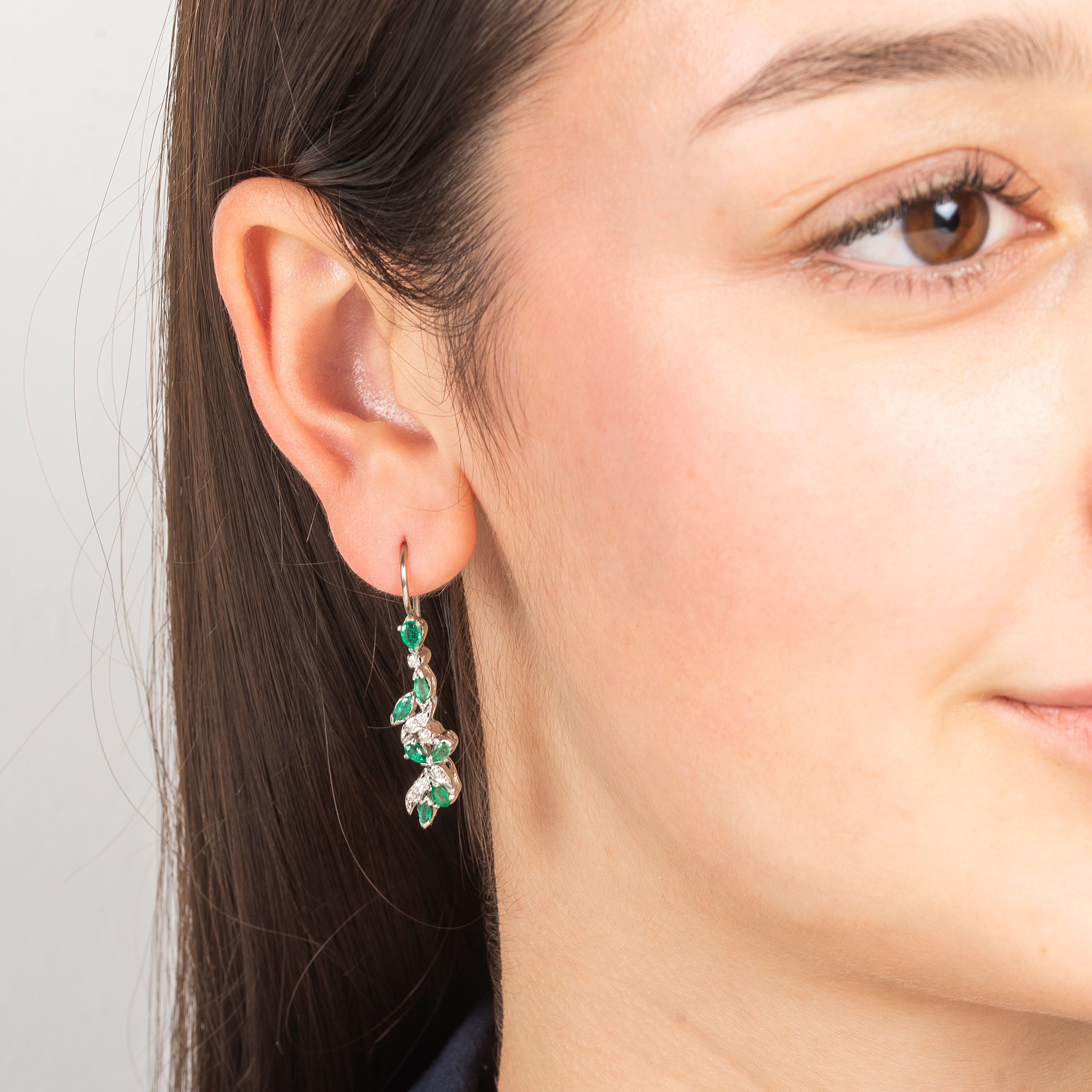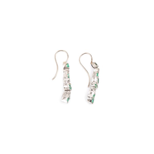 Paio di orecchini pendenti in oro bianco 18 kt, diamanti e smeraldi