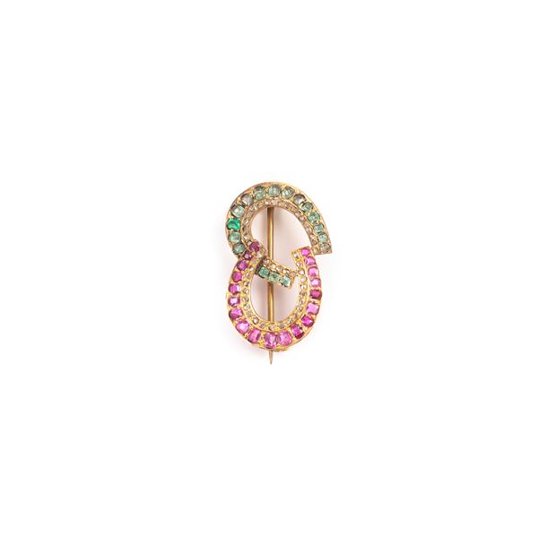 Spilla doppio Ferro di cavallo in oro 14 kt, diamanti, smeraldi e rubini