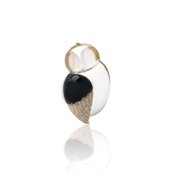 Spilla Gufo in oro bianco 18 kt, cristallo, smalto nero e diamanti