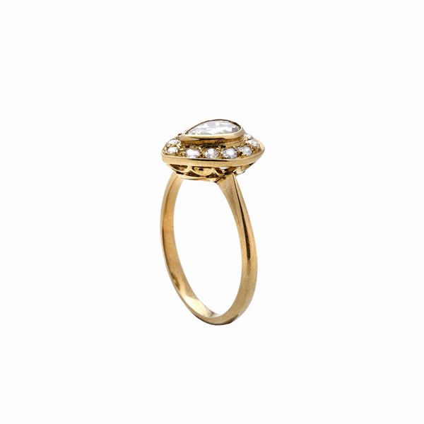 MATERIAL:yellow gold and diamonds DESCRIPTION: ring shaped as a heart, at the center diamonds heart cu, framed by one line of diamonds MEASURE: 6 WEIGHT: central diamond ct 0.50, tot ct 0.70, gr 3.3