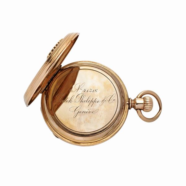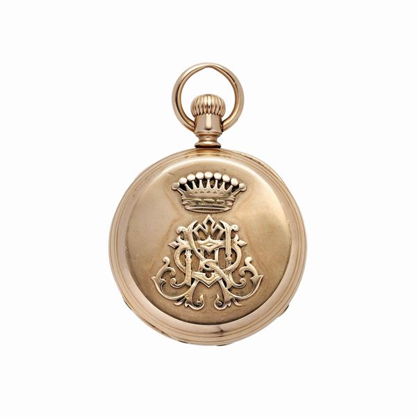 MATERIAL: 18 kt yellow gold DESCRIPTION: savonette cash, winding crown with a 12-hour ring, white enamel dial with Roman numerals, leaf and pear-shaped hands, seconds at six o'clock, manual winding movement, back with initials AM with crown applied MEASURES: num. 41316, 53 mm diam