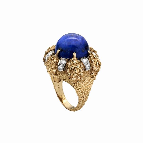 MATERIAL: yellow gold 18 kt, white gold, diamonds and lapis lazuli DESCRIPTION: ring with a huge central lapis lazuli made as a cabochon, put on a base embellished with diamonds and engraved gold, bears the marck 18 kt MEASURE: 8 WEIGHT: diamond ct 0.60, gr 24.3