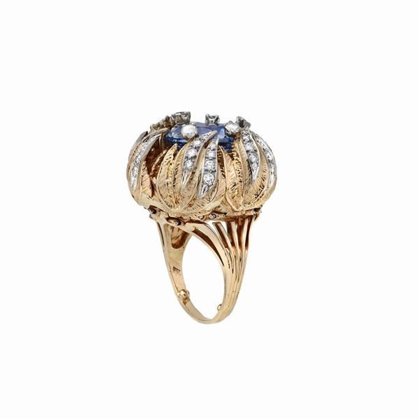 MATERIAL: yellow gold 14 kt, white gold, diamonds, blue topaz DESCRIPTION: ring made as a flower, at the center huge blue topaz, petals embellished with diamonds, with movable mechanism, blocked, bears the marck 14 kt MEASURE: 4 WEIGHT: diamond ct 1.70, gr 22.6