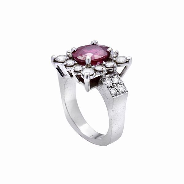 MATERIAL: white gold, diamonds and ruby DESCRIPTION: Ring made as a daisy in white gold, at the center one ruby oval cut, embellished with diamonds, provided with certificate IGI MEASURE: 5.5 WEIGHT: ruby ct 2.50, diamonds ct 1.20, gr 10.7