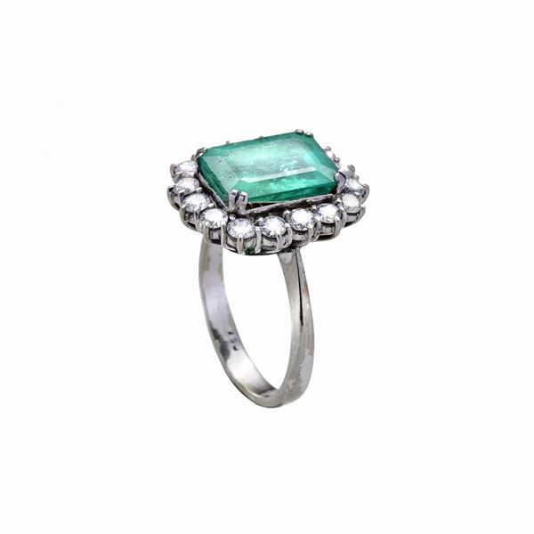 MATERIAL: white gold 750, diamonds and emerald DESCRIPTION: ring made as a daisy in white gold, at the centre one emerald cabochon cut, embellished with diamonds, bears the marck 750 MEASURE: 7 WEIGHT: emerald ct 3.0, diamonds ct 1.30, gr 7.5