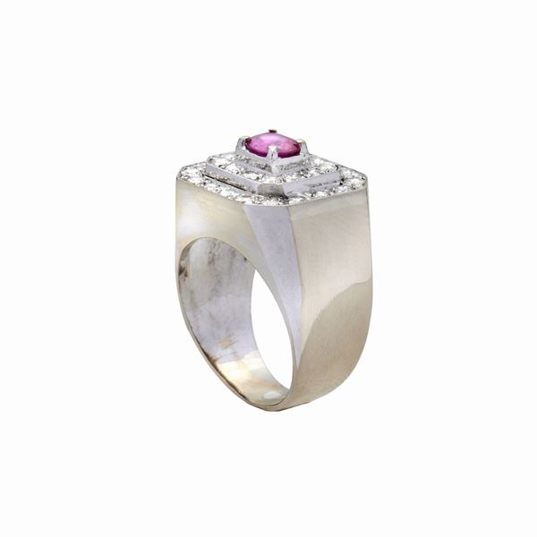 MATERIAL: white gold, diamond and ruby DESCRIPTION: octagonal ring made with oval cut ruby on a base adorned with pave diamonds, bears the mark 750 SIZE: 8 WEIGHT: ruby 0.70 ct, 1.20 ct diamonds, gr 19.5
