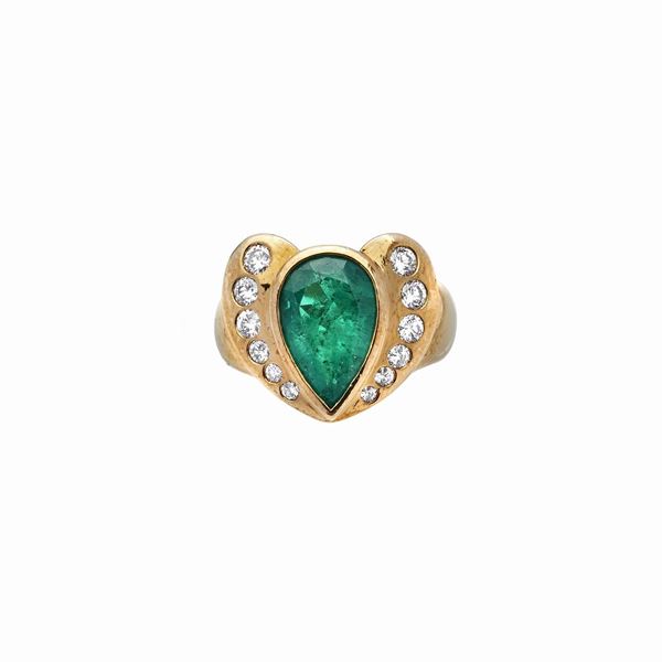 MATERIAL: yellow gold, diamonds and emerald DESCRIPTION: ring made with a central emerald drop-cut framed at the sides by twelve brilliant-cut degradè diamonds, bears the mark 750 MEASURES: 7 WEIGHT: 3,0 ct emerald, diamonds approximately 1.0 ct , 11.3 g